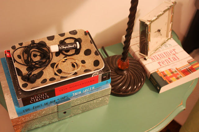 I also keep a tray by my bedside so that I can throw whatever I need on there before I go to bed. Oh, and I'm obsessed with chapstick. I can't go a day (or more like a couple hours) without it so it's always by my bedside. And, I HAVE to have my headphones so I can plug in music or an episode of Parks and Rec if I can't sleep. It's a bad habit...